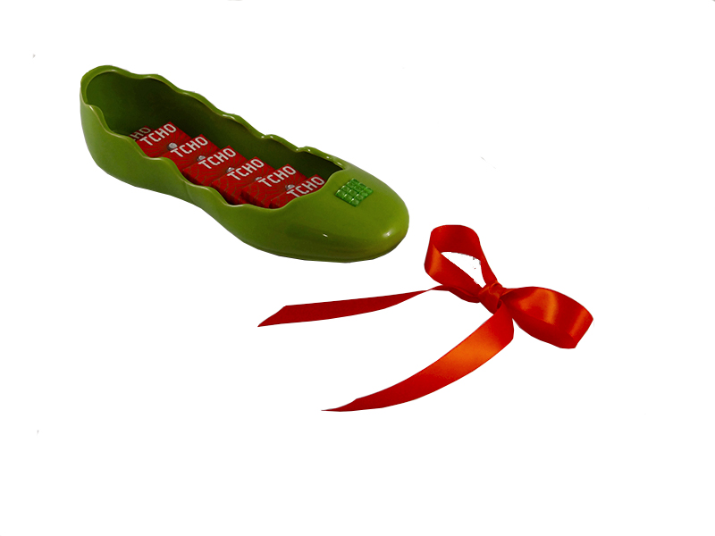 Enjoy this wonderful unique arrangement with sweet organic chocolates all placed in a wonderful ceramic shoe!